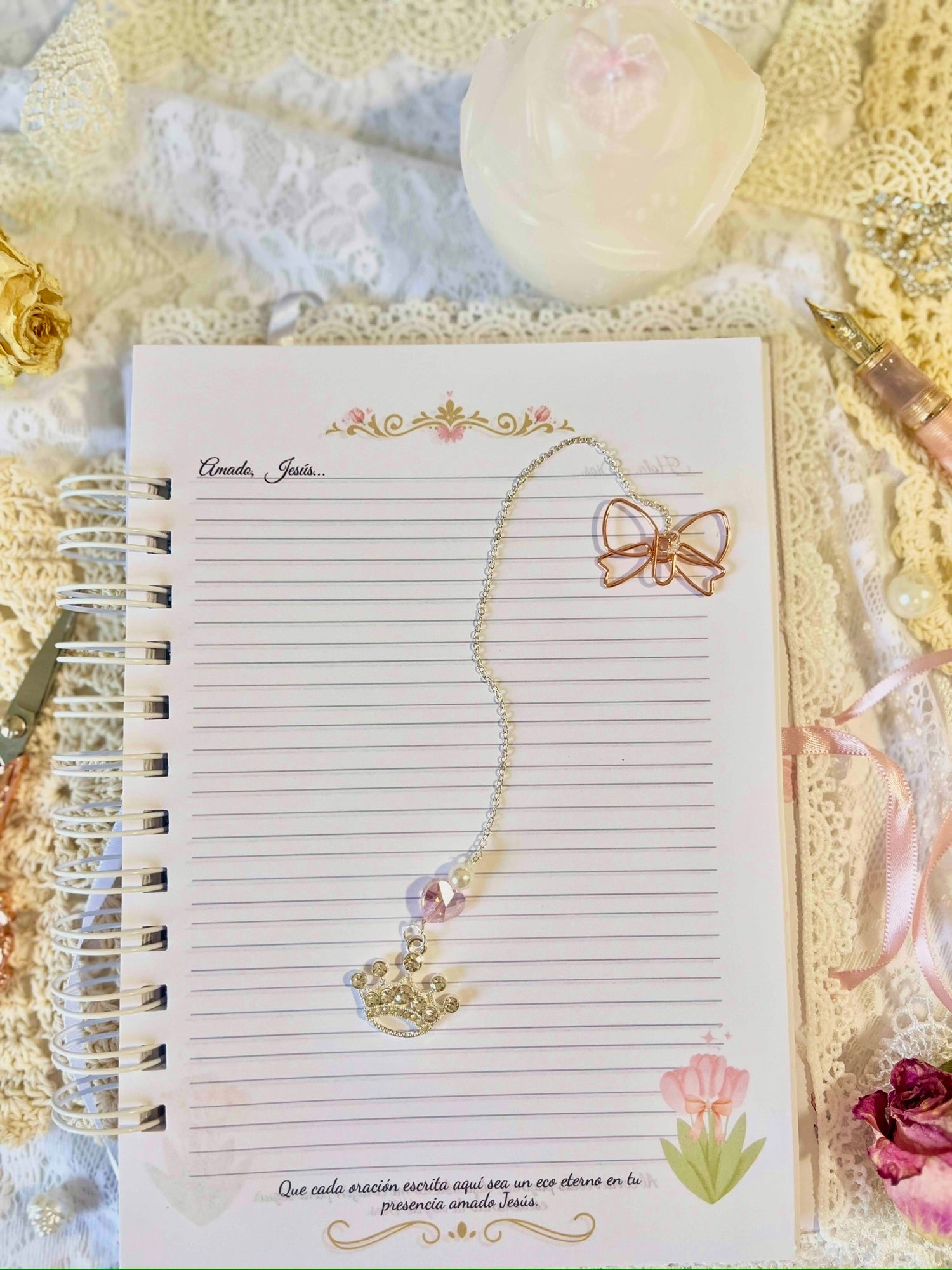 Colgante marcapáginas de Gancho con forma de Moño 🎀 : lindo y acogedor: haga que sus diarios y libros sean un poco más bonitos. Hecho a mano con una cadena en plata, perlas y una hermosa corona de colgante en diamantes y plata de alta calidad.
